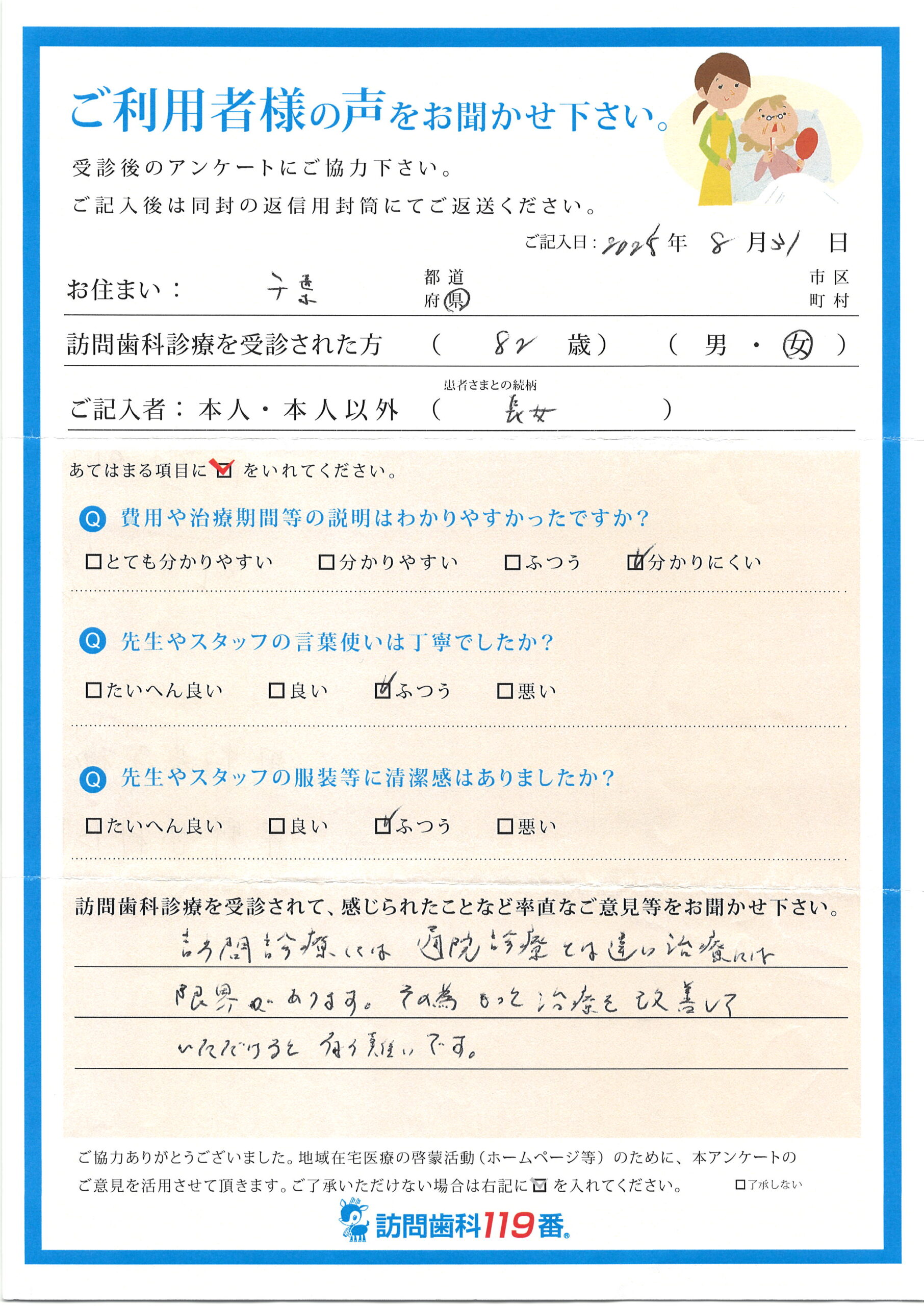 千葉県 82歳 女性回答者:娘様 回答日:2025.8.31相談内容