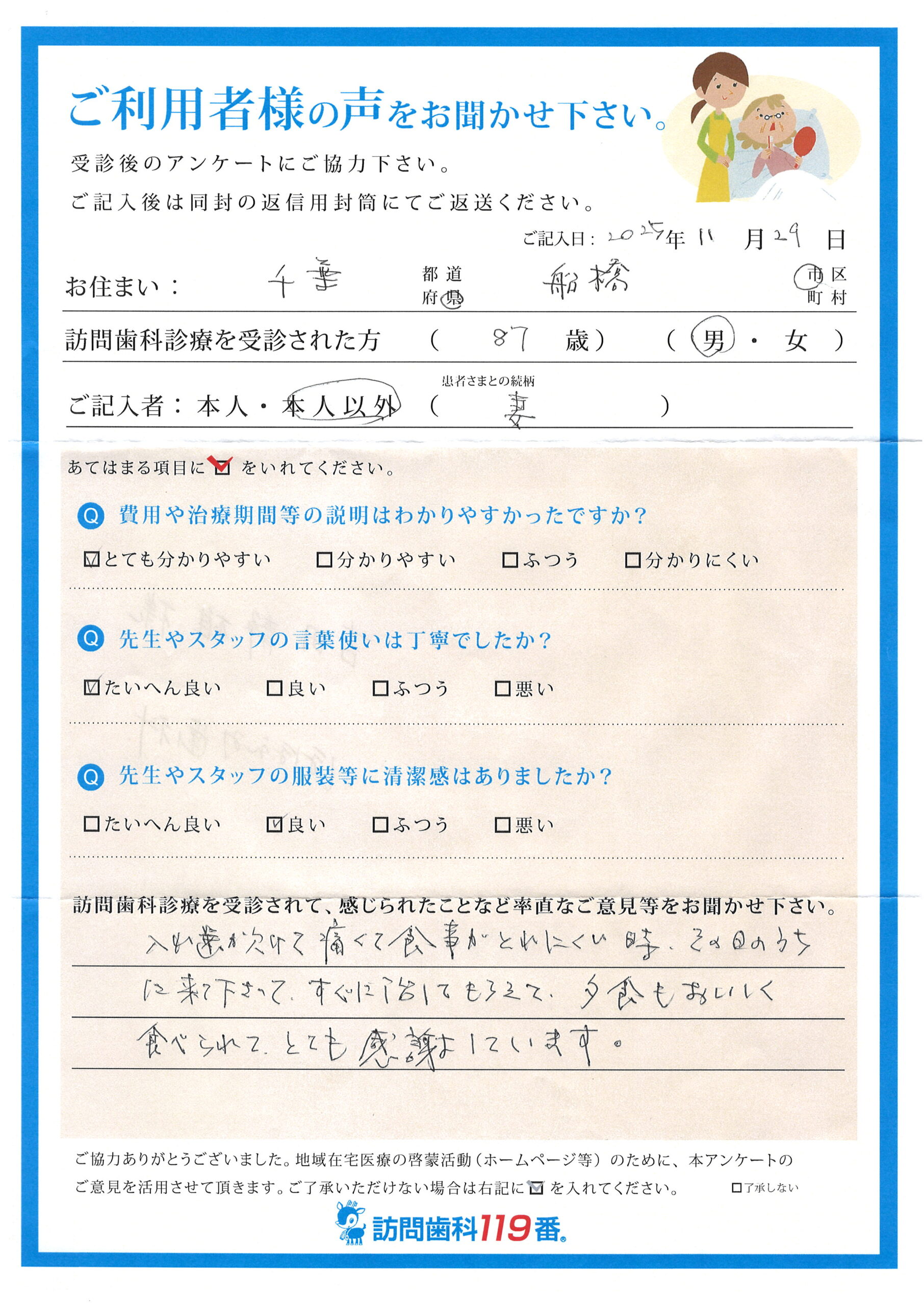 千葉県 船橋市 87歳 男性回答者:妻 回答日:2025.11.29相談内容