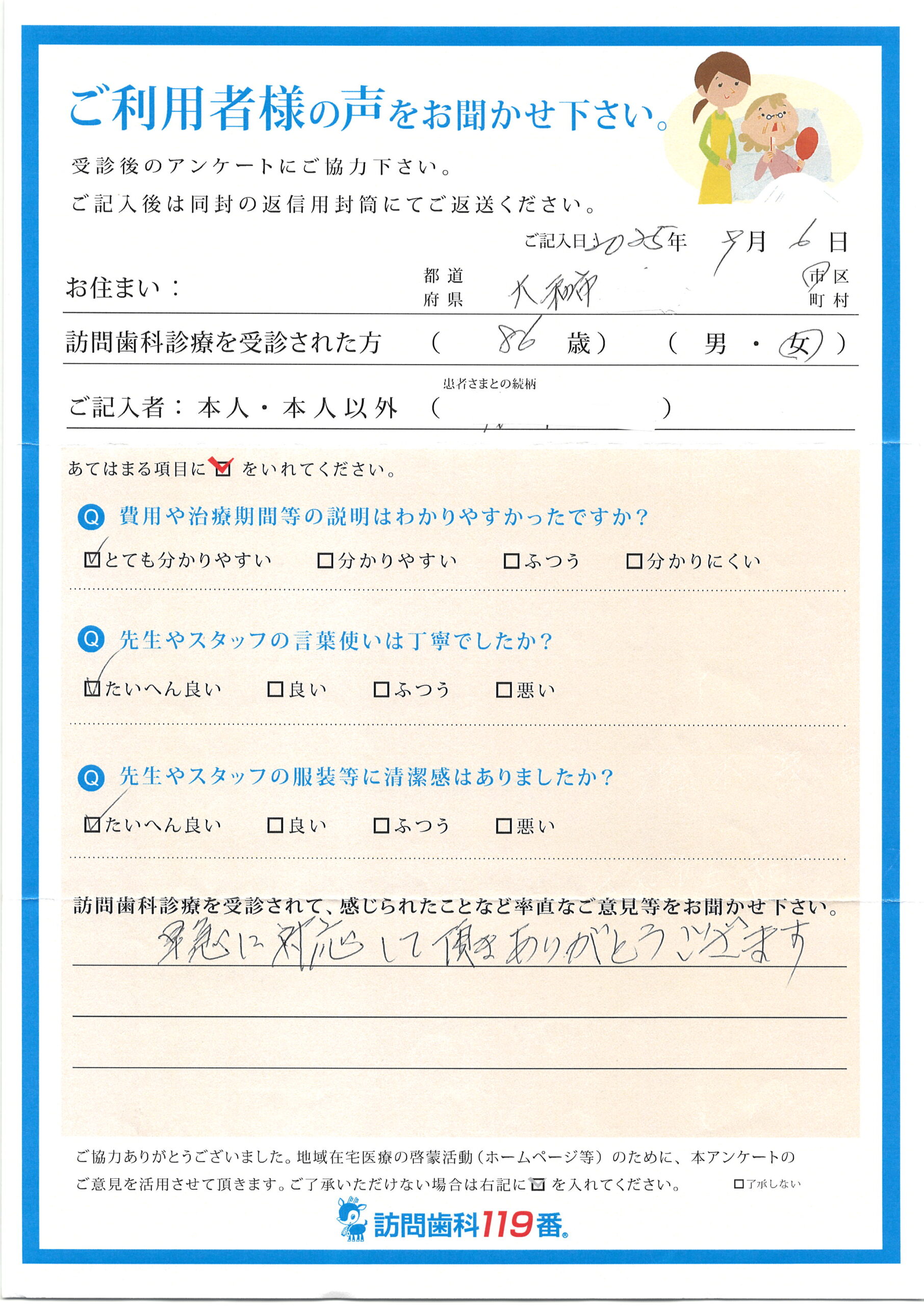 神奈川県大和市 86歳 女性回答者:妻 回答日:2025.9.6相談内容