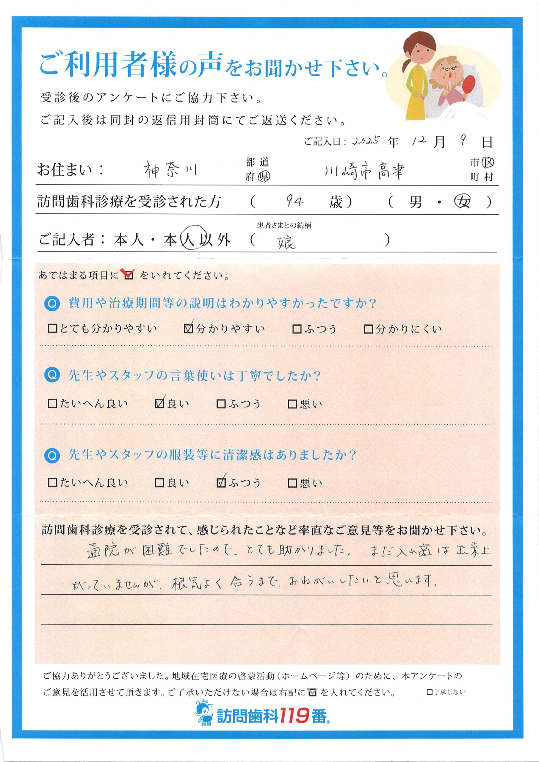 神奈川県川崎市 94歳 女性回答者:娘様 回答日:2025.12.9相談内容