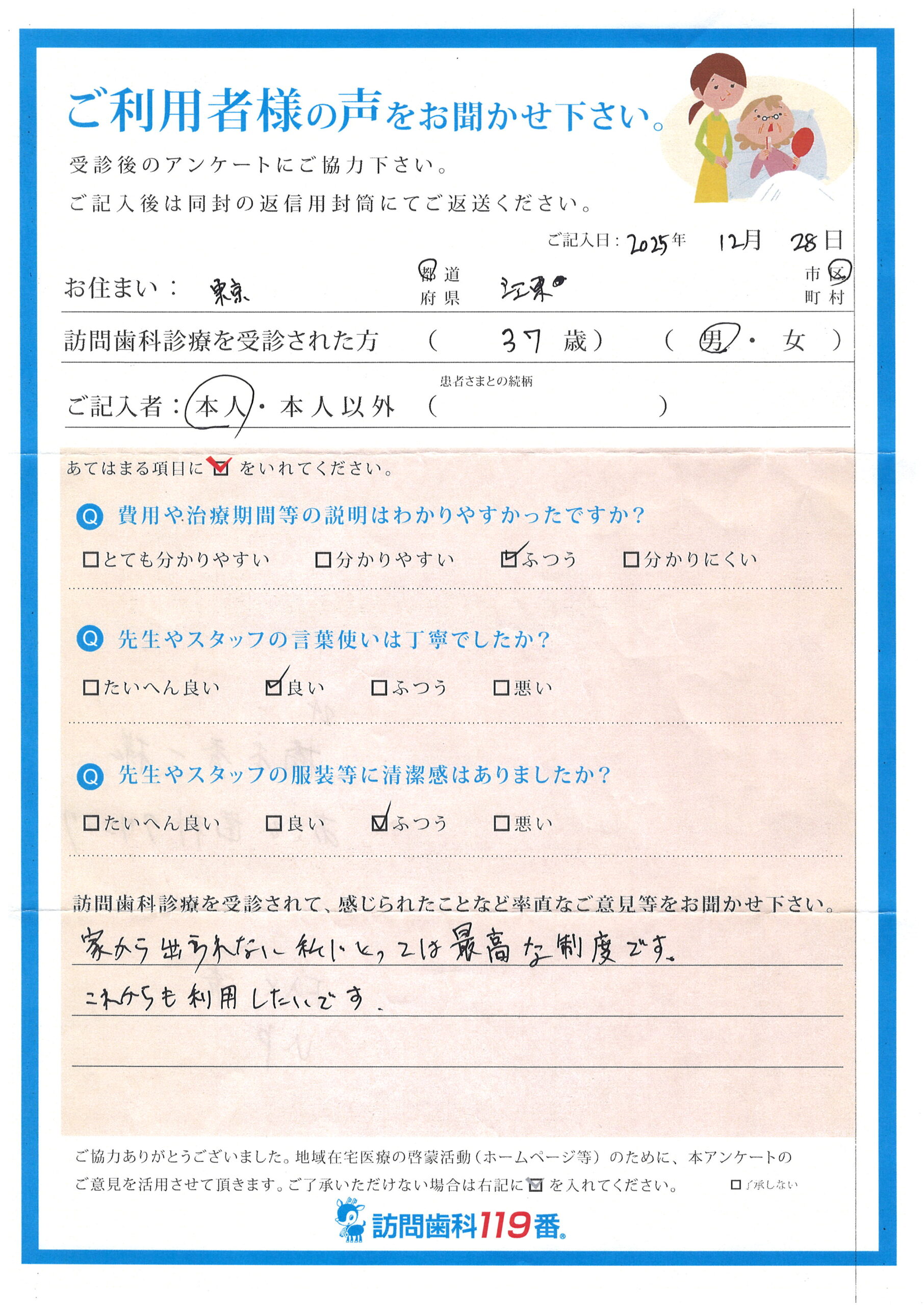 実際に訪問歯科診療を受診されたご利用者さまの声をご紹介させていただきます。