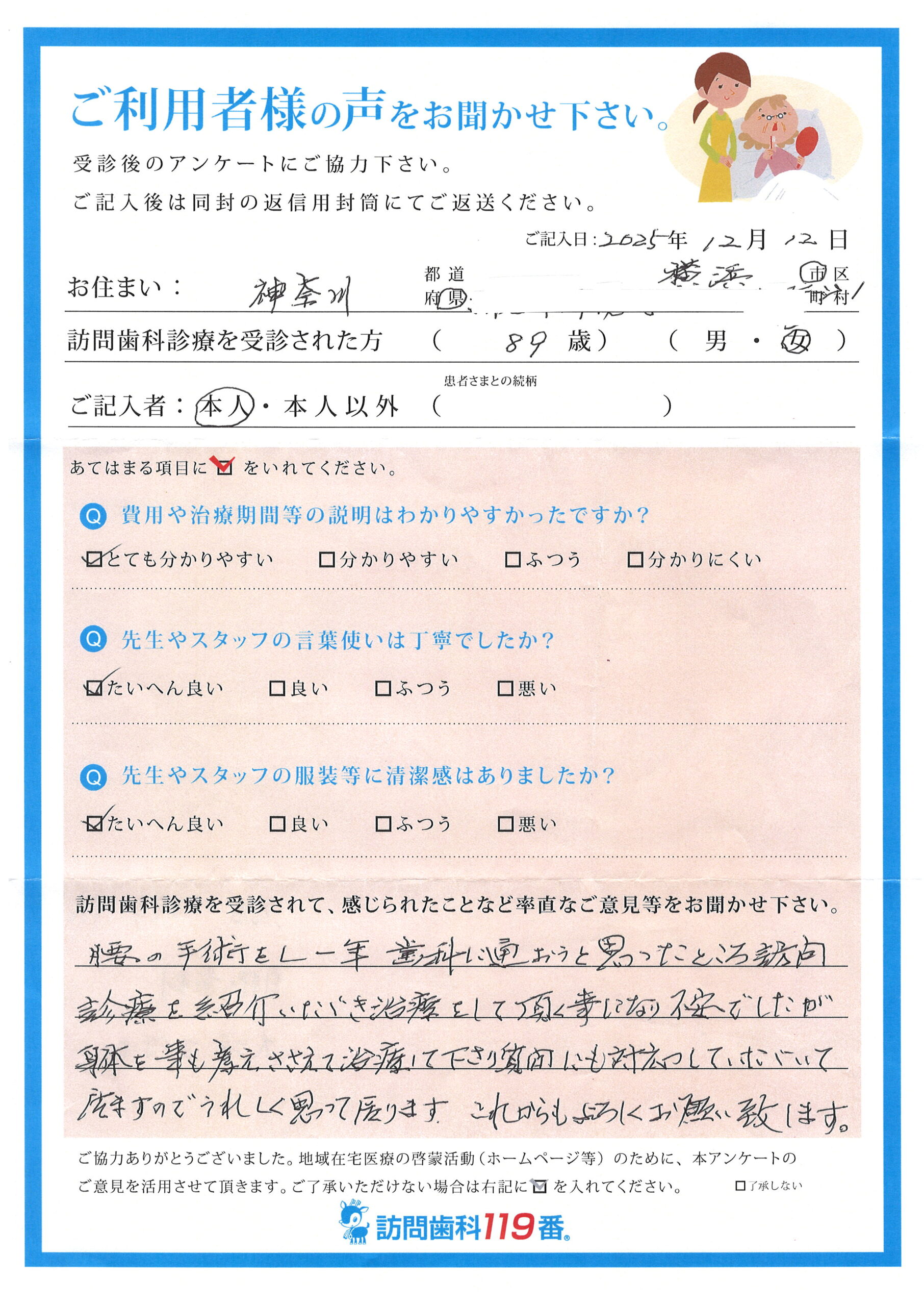 神奈川県横浜市 89歳 女性回答者:ご本人様 回答日:2025.12.12相談内容