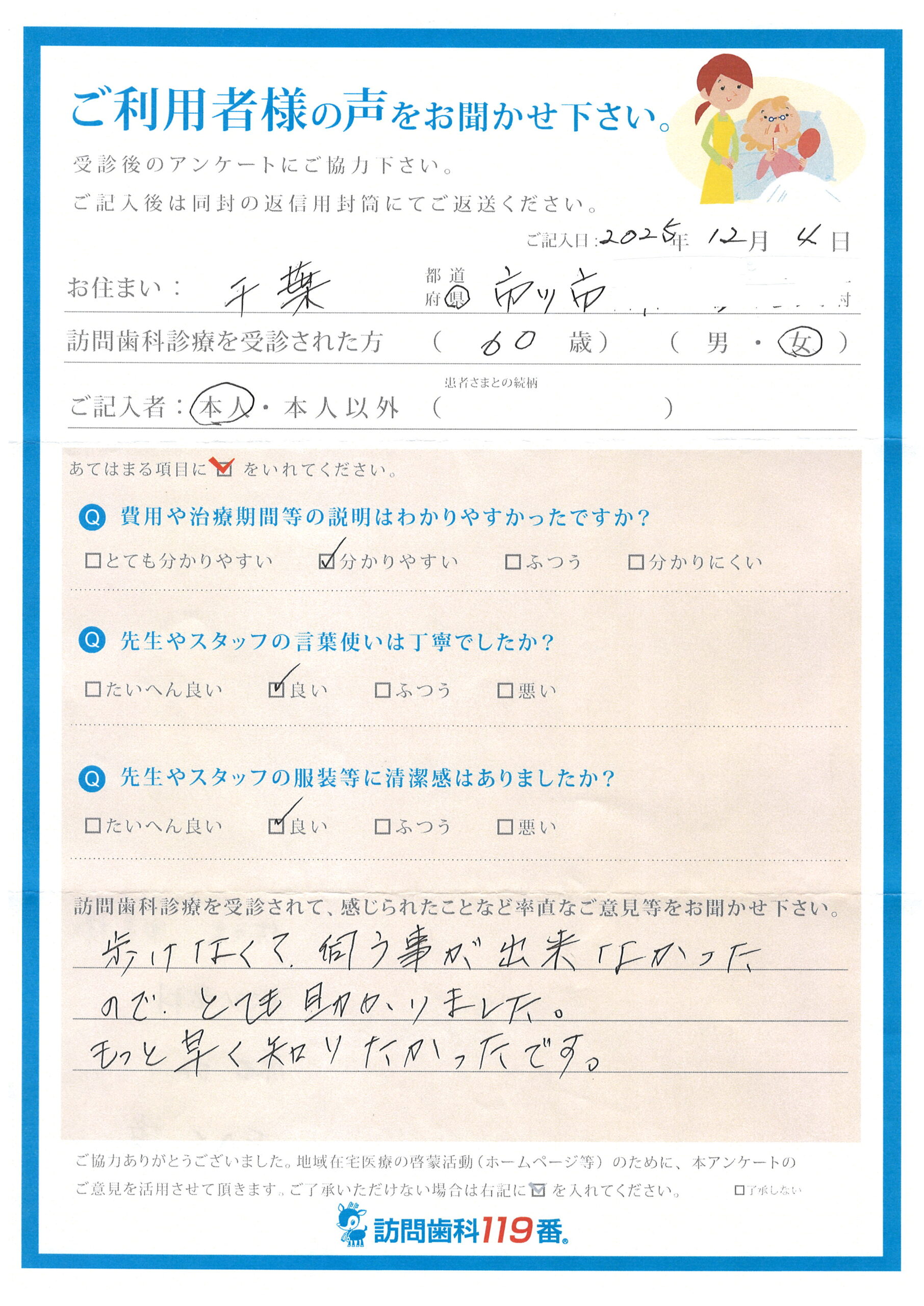 実際に訪問歯科診療を受診されたご利用者さまの声をご紹介させていただきます。