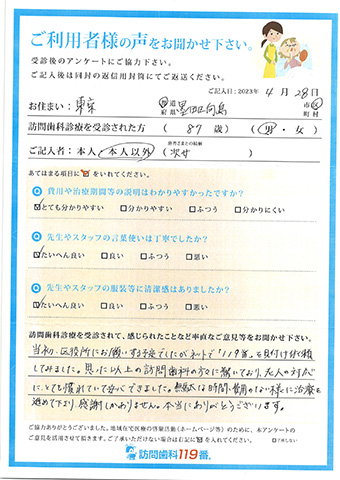 実際に訪問歯科診療を受診されたご利用者さまの声をご紹介させていただきます。