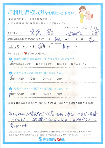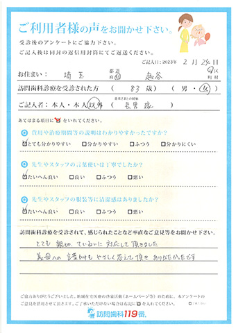実際に訪問歯科診療を受診されたご利用者さまの声をご紹介させていただきます。