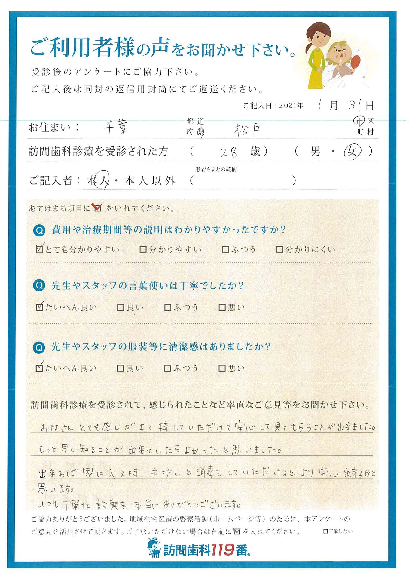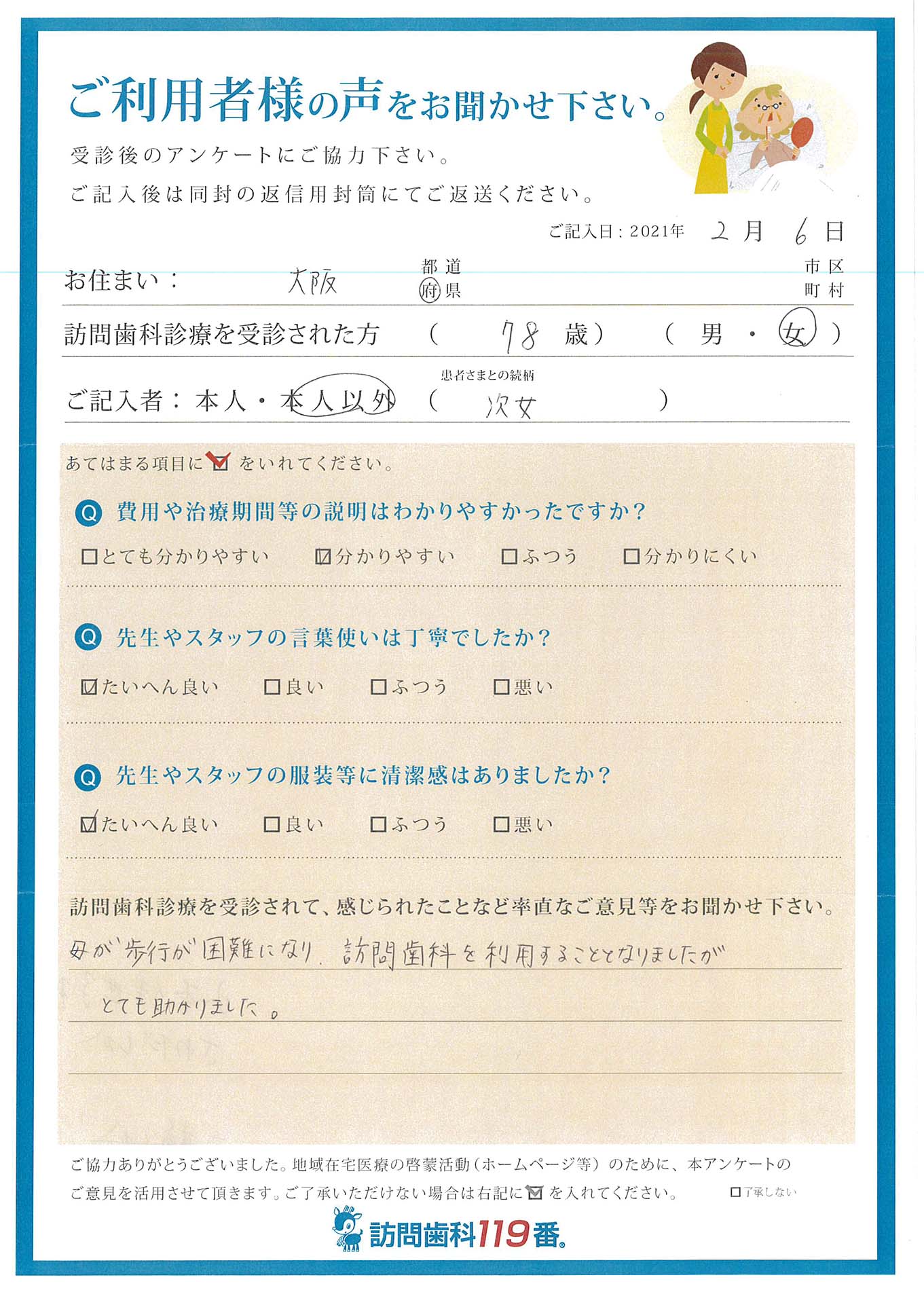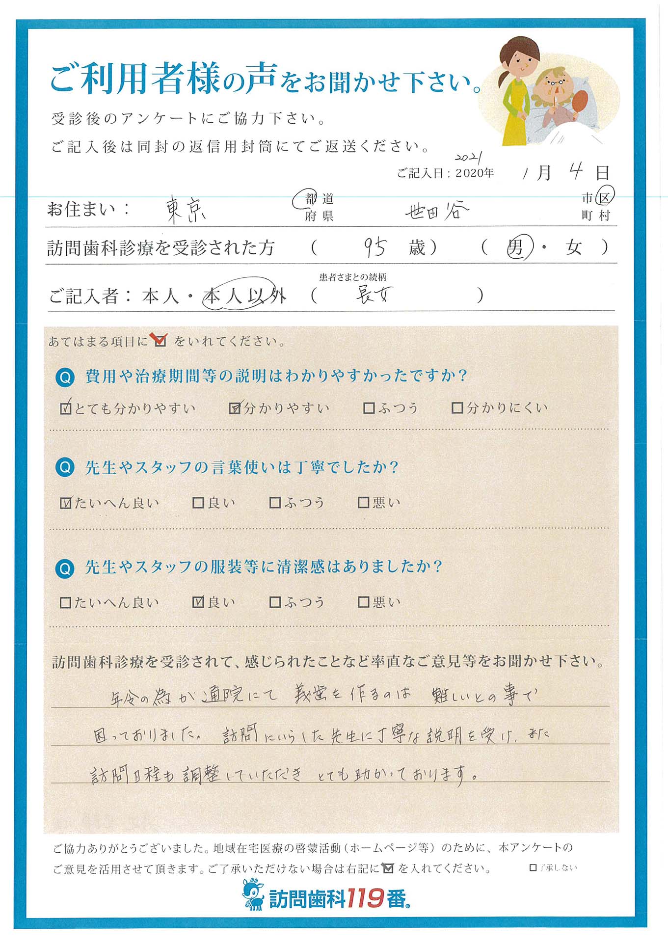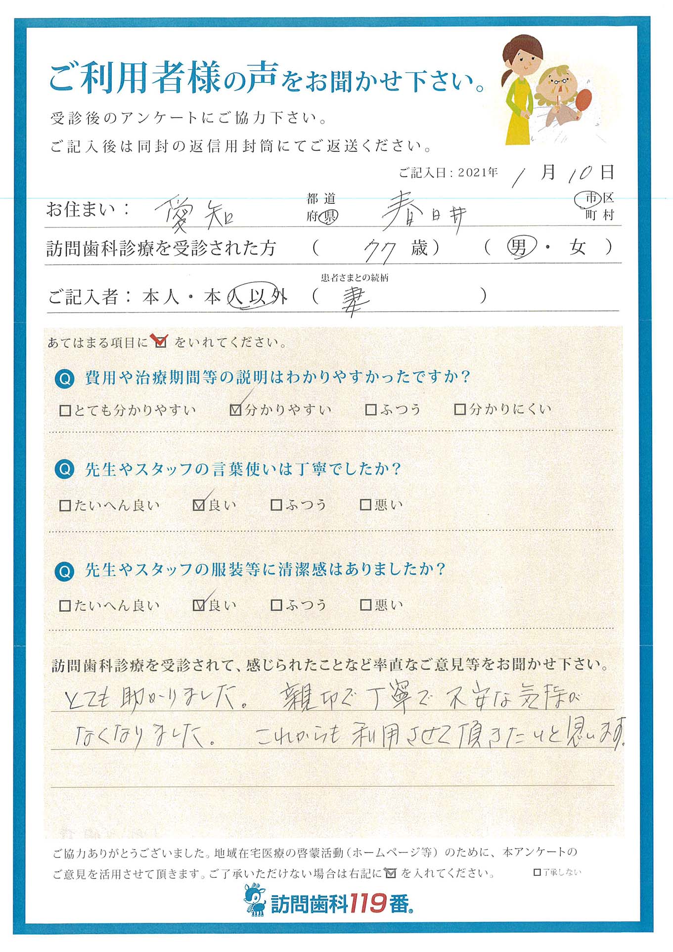 実際に訪問歯科診療を受診されたご利用者さまの声をご紹介させていただきます。