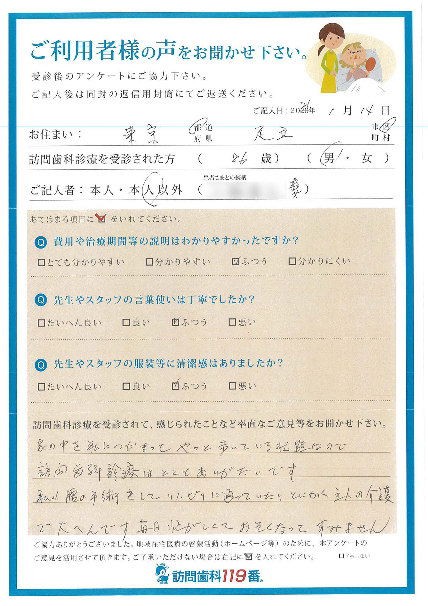 東京都足立区 86歳 男性回答者:奥様 回答日:2024.01.04相談内容